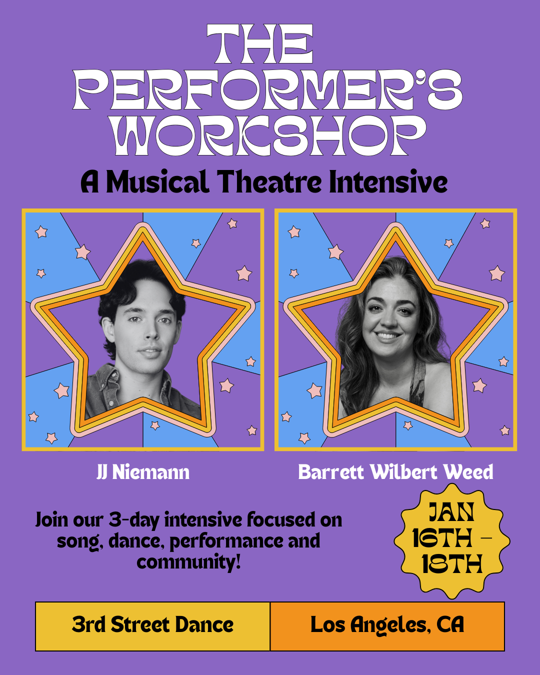 Step into the spotlight with JJ Niemann (Back to the Future, Hamilton) and Barrett Wilbert Weed (Mean Girls, Heathers) at The Performer’s Workshop.